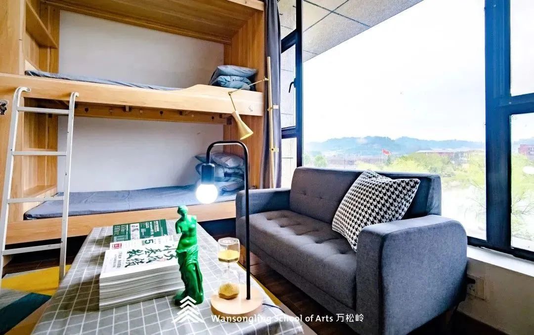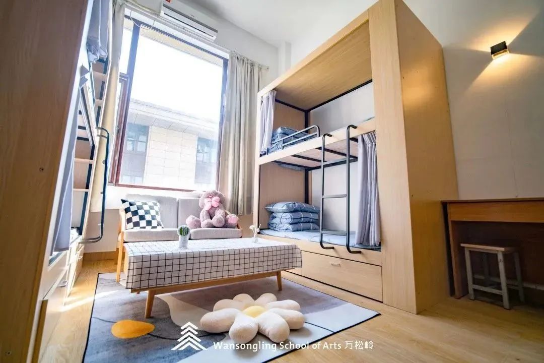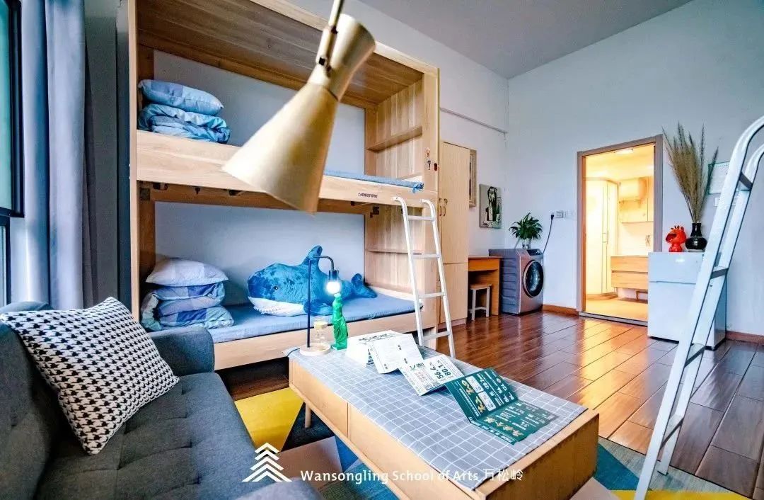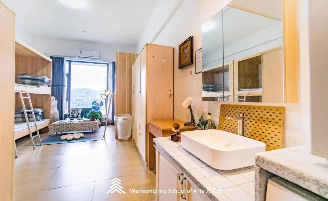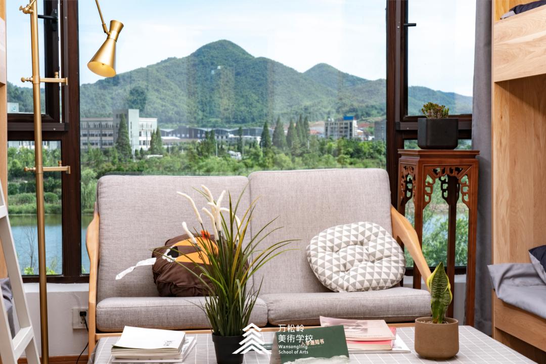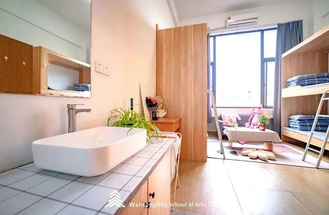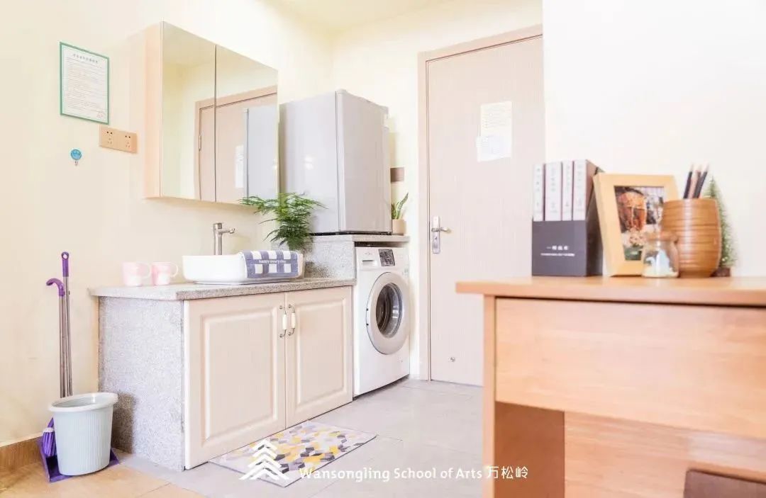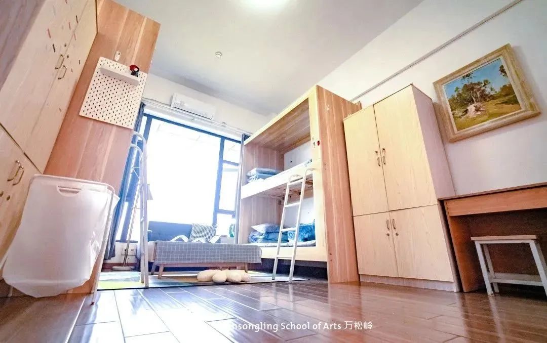 萬松嶺校園宿舍持續(xù)升級 原木風(fēng)床鋪、衣柜、沙發(fā)、桌凳,配齊冰箱、洗衣機(jī)、熱水器、盥洗池……獨立衛(wèi)浴做到干濕分離,主打溫馨舒適,滿足美術(shù)生日常生活需求。更有超大玻璃采光+360°校園美景,隨時給你提供更多藝術(shù)靈感~