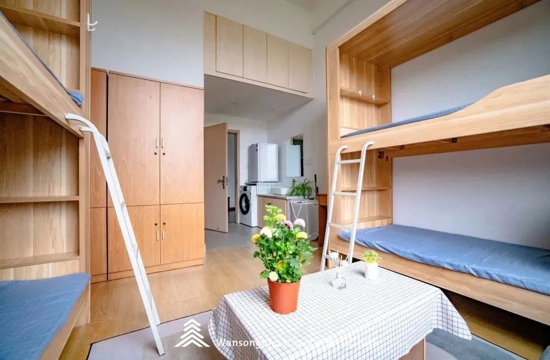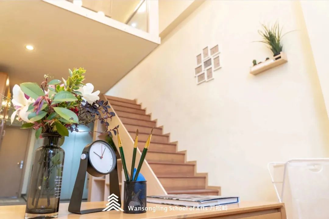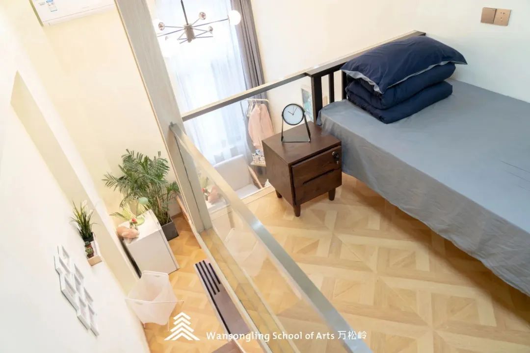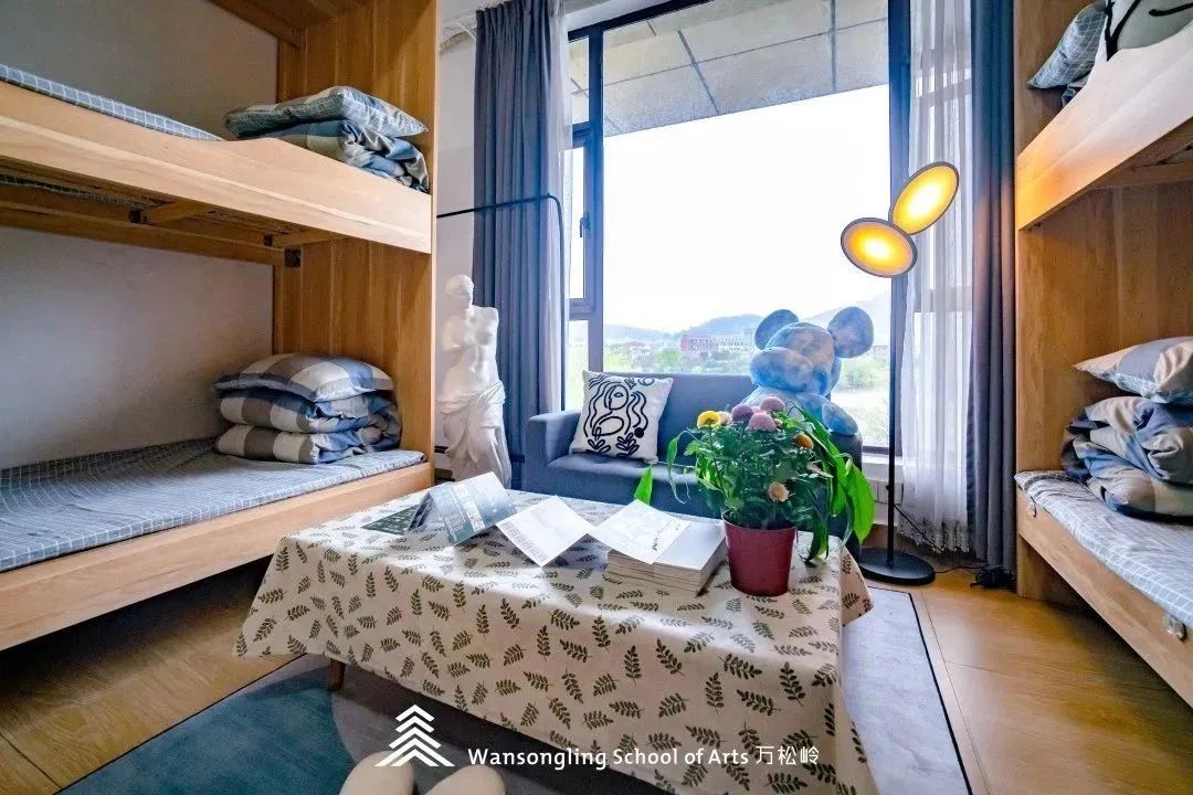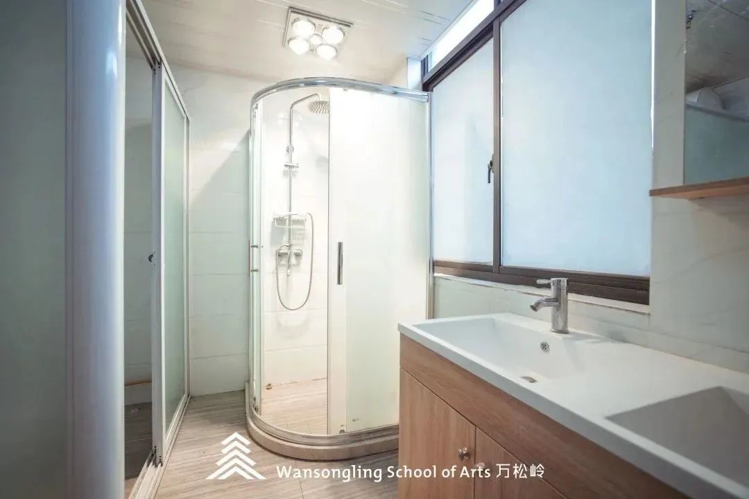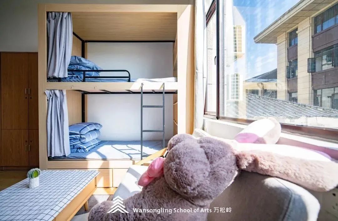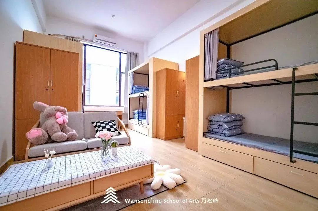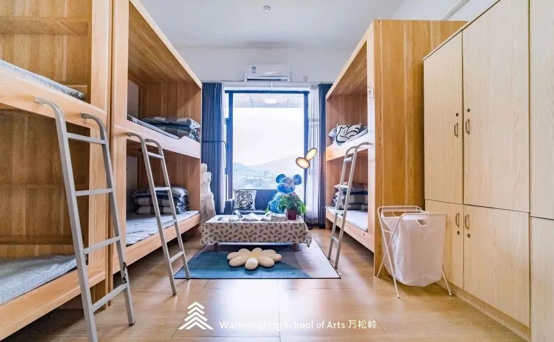 萬松嶺校園宿舍持續(xù)升級 原木風(fēng)床鋪、衣柜、沙發(fā)、桌凳,配齊冰箱、洗衣機(jī)、熱水器、盥洗池……獨立衛(wèi)浴做到干濕分離,主打溫馨舒適,滿足美術(shù)生日常生活需求。更有超大玻璃采光+360°校園美景,隨時給你提供更多藝術(shù)靈感~