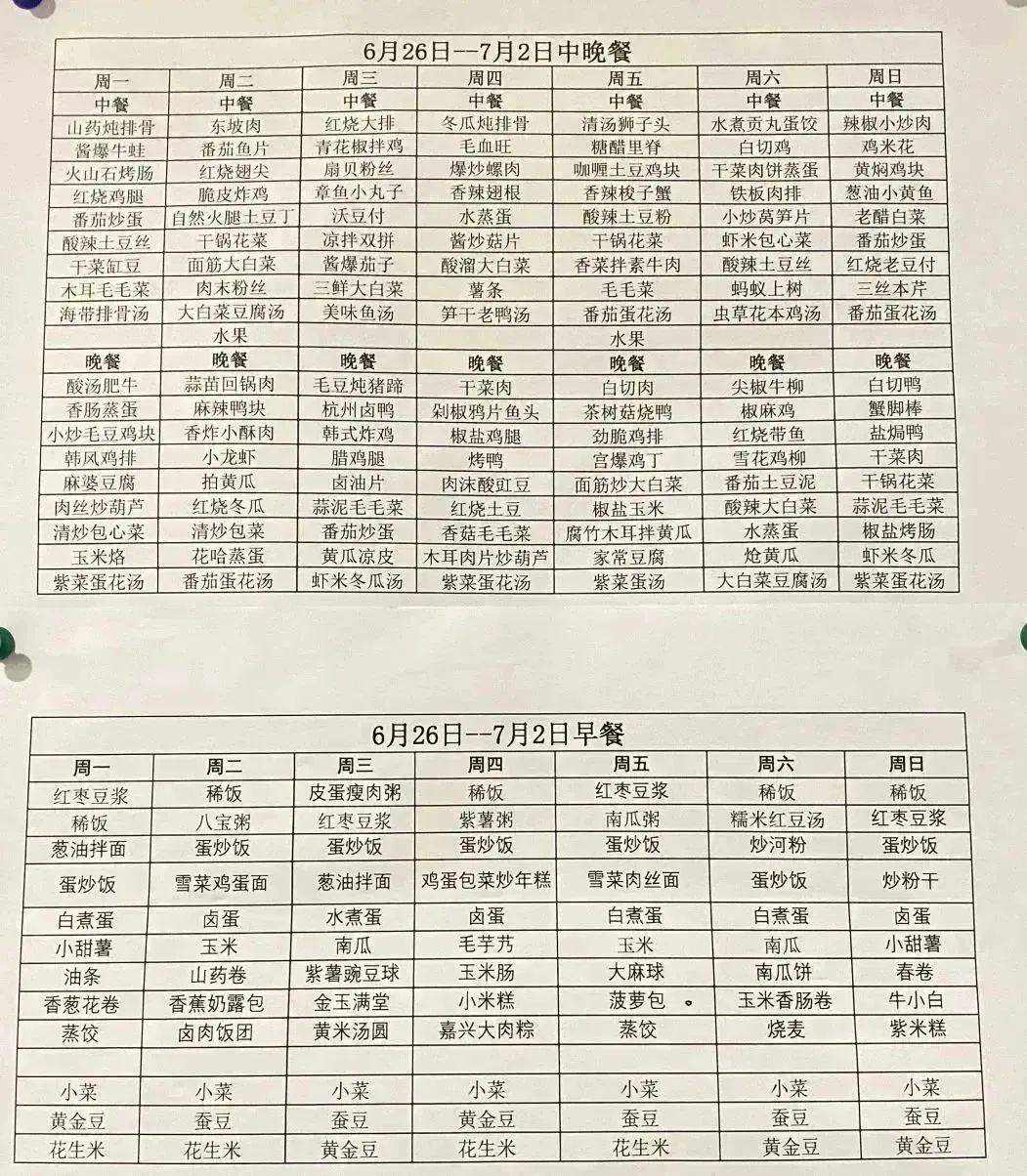 午餐/晚餐供應(yīng)標(biāo)準(zhǔn):每餐準(zhǔn)備4大葷+2花葷+2素菜+2小菜+1咸湯(排骨湯/老鴨湯/魚頭湯/蛋花湯等)/甜湯(綠豆湯/銀耳湯等)+不定期時(shí)令新鮮水果,另外吃完可以再續(xù),吃飽為止。