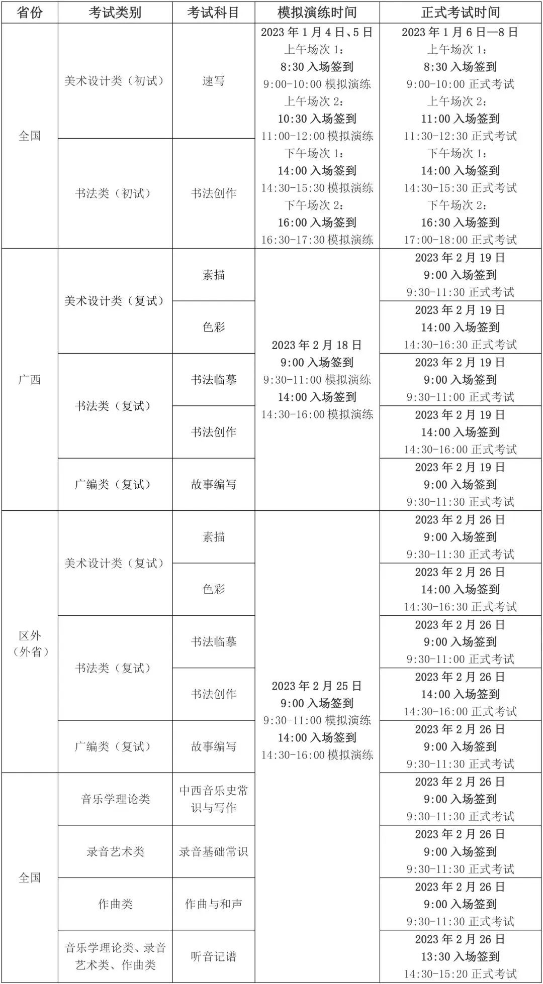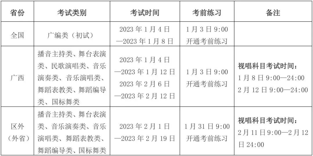 我校將根據(jù)實時監(jiān)考科目的報名人數(shù),以計算機(jī)隨機(jī)方式編排各場次考試,考生具體場次以準(zhǔn)考證公布為準(zhǔn)。每位考生有兩場模擬演練機(jī)會,一場為無監(jiān)考員模擬演練,考生可自行熟悉考試流程、測試考試網(wǎng)絡(luò)環(huán)境;一場為實時監(jiān)考模擬演練,考生可通過演練規(guī)范監(jiān)考機(jī)位架設(shè)、熟悉監(jiān)考員考試指令。建議考生參加兩場模擬演練,以保證正式考試的順利進(jìn)行。 由于浙江、上海、山東、新疆在1月6日-8日期間有高考或藝術(shù)統(tǒng)考,我校已對以上4省(自治區(qū)、直轄市)美術(shù)設(shè)計類、書法類初試時間進(jìn)行調(diào)整或明確,詳見《廣西藝術(shù)學(xué)院關(guān)于浙江、上海、山東、新疆2023年藝術(shù)類本科專業(yè)招生考試美術(shù)設(shè)計類、書法類初試考試時間的通知》。1.了解招生政策:認(rèn)真閱讀《廣西藝術(shù)學(xué)院2023年本科招生專業(yè)(方向)、考試內(nèi)容及要求》、《廣西藝術(shù)學(xué)院2023年藝術(shù)類本科專業(yè)招生考試考生須知》、《廣西藝術(shù)學(xué)院2023年藝術(shù)類本科專業(yè)招生考試網(wǎng)絡(luò)提交視頻拍攝要求》、《廣西藝術(shù)學(xué)院2023年藝術(shù)類本科專業(yè)招生考試示范片》,充分了解廣西藝術(shù)學(xué)院藝術(shù)類本科招生相關(guān)招考政策和考試要求。