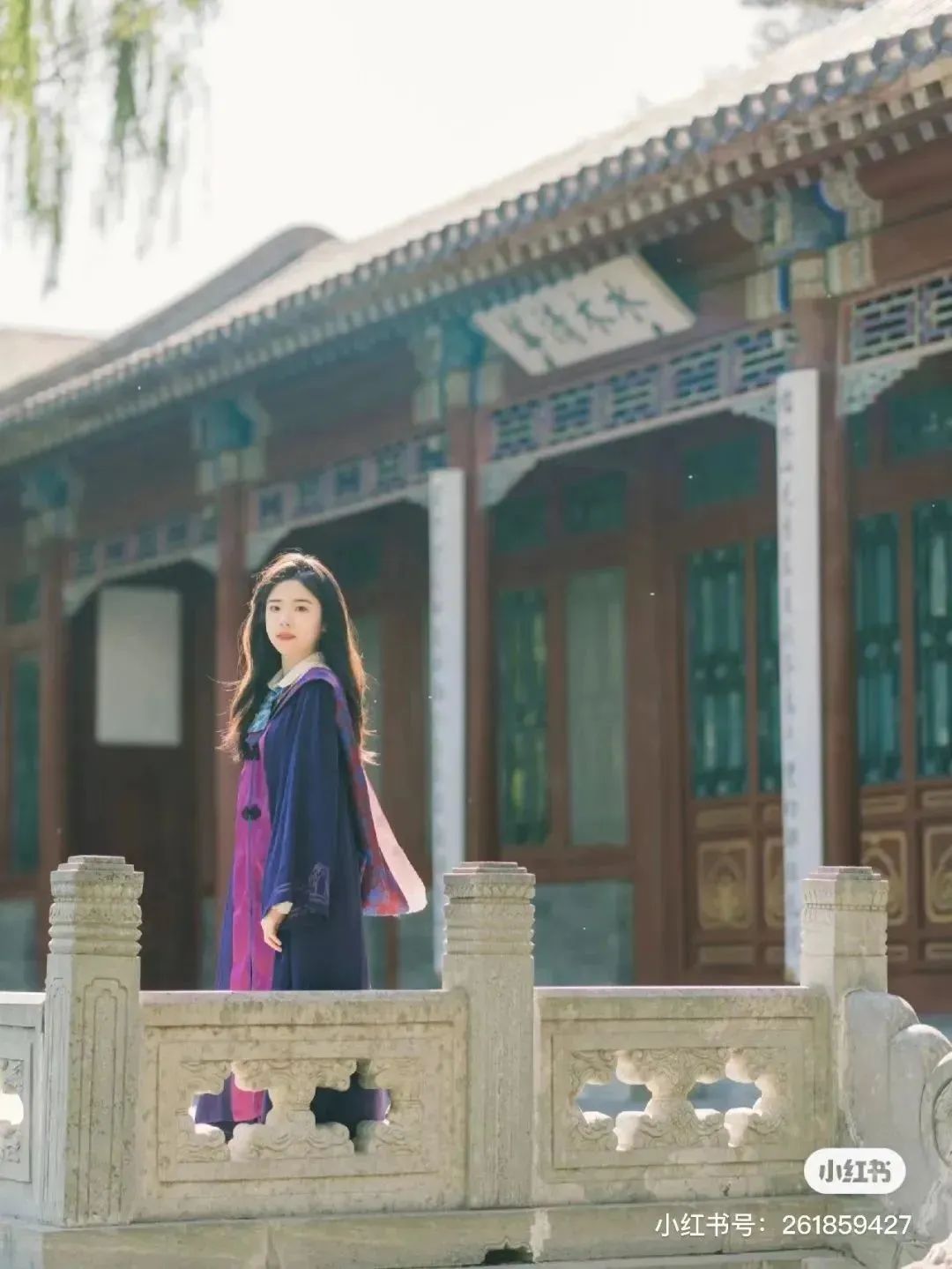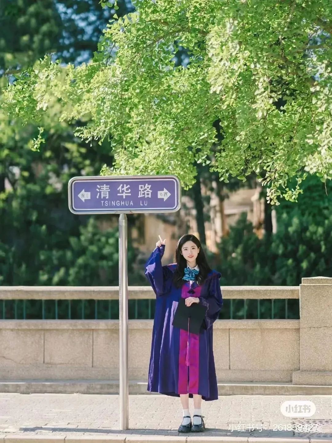 本科生學(xué)士服,披肩上繡著兩款不同的校花,紫荊花和丁香花,袖口用簡約的線條勾勒出,清華建筑二校門,衣服前面的門襟是紫紅色。
